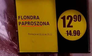 Święta blisko, więc wielu klientów rozgląda się za rybami. Znaleźliśmy ciekawe zaproszenie do zakupu smacznej ryby. W jednym z marketów uwagę przyciągał produkt opisany jako „flondra paproszona”. Problem w tym, że autor etykiety najwyraźniej pomylił słowo „patroszona” z „paproszona”. Zamiast informacji o przygotowanej już do obróbki ryby, klient otrzymał opis sugerujący przypadkowe oprószenie czymś bliżej nieznanym. Sytuację dodatkowo komplikuje błąd ortograficzny, zamiast poprawnej formy „flądra” (z „ą”) widnieje zapis „flondra”. W efekcie jedna etykieta łączy w sobie kulinarną nieścisłość i językową wpadkę, które skutecznie budzi więcej ciekawości niż sam produkt. Czasem wystarczy jeden paproch i jedno zgubione „ą”, by promocja stała się lekcją ortografii…