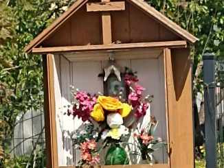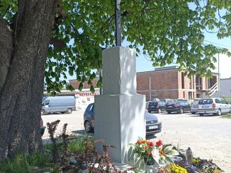 Na niewielkim wzniesieniu, obłożonym kamiennymi głazami, będącym kolorowym ogródkiem skalnym, stoi betonowy, dwuczęściowy postument z wysokim metalowym krzyżem z ukrzyżowanym Chrystusem. Postument pomalowany jest na biało (bez żadnych dat czy napisów), krzyż natomiast jest znacznie […]