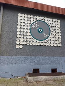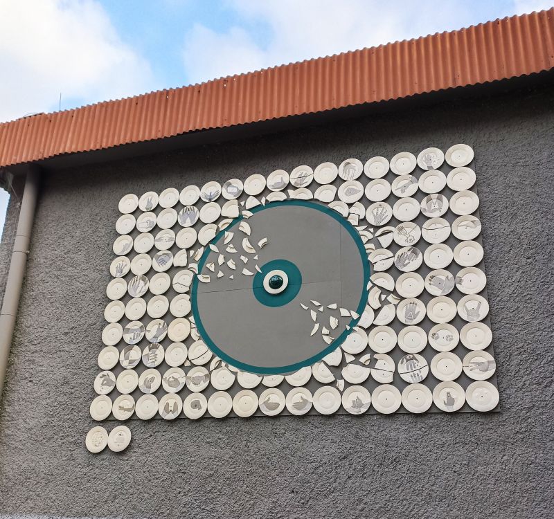 Na dawnym budynku BWA pojawiła się ciekawa dekoracja, której pomysłodawczynią jest Jolanta Szymanowska. Jej przesłaniem jest wskazanie możliwości wykorzystania odpadów ceramicznych. Są to „resztki” zestawów ceramicznych przygotowanych do ozdobienia Dworca PKS. Są to talerze, na których odbite są dłonie, stanowią reprezentację mieszkańców miasta oraz kieleckich firm i stowarzyszeń. Instalacja nosi nazwę „Społeczna mozaika”.