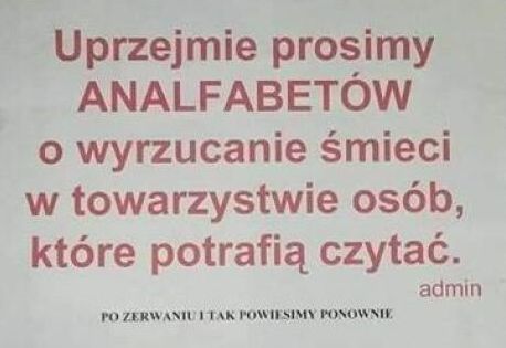 Segregacja śmieci to niejako obowiązek każdego kulturalnego człowieka, dla którego naturalne środowisko Ziemi jest sprawa istotną. Od 2019 roku obowiązuje odpowiedni podział odpadów, dlatego pojawiły się kolorowe pojemniki z podpisami (dla ułatwienia!). Ponadto w wielu „altankach śmieciowych” są także tablice informujące, co, gdzie i jak, choćby po to, by nie rosły koszty wywozu nieczystości. Ta prosta forma działania sprawia jednak niektórym wiele problemów, dlatego np. na osiedlach pojawiają się podpowiedzi właściwego postępowania. Prezentujemy taki przykład, oby nauka nie poszła w las!