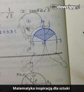 Znaleźliśmy ciekawy obrazek, ktoś zdecydowanie miał więcej wyobraźni niż chęci do rozwiązywania zadań z trygonometrii. Z półokręgu i osi współrzędnych powstała pełnoprawna postać w stylu anime. Matematyka nie tylko inspiruje do liczenia, ale też do tworzenia sztuki – czasem zupełnie nieoczekiwanej.