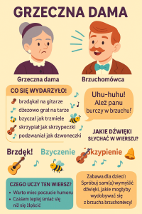 - Wiersz „Grzeczna dama” to pełna humoru i dźwiękonaśladowczych zabaw historyjka o eleganckiej pani, której spokój zakłóca brzuchomówca – artysta potrafiący „mówić brzuchem”.