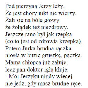 - Wiersz ważny tematycznie: Choroba chłopca spowodowana brakiem higieny.