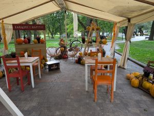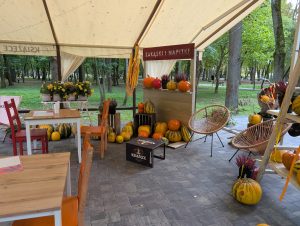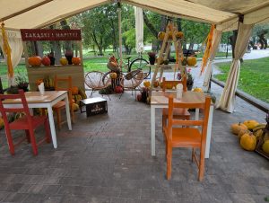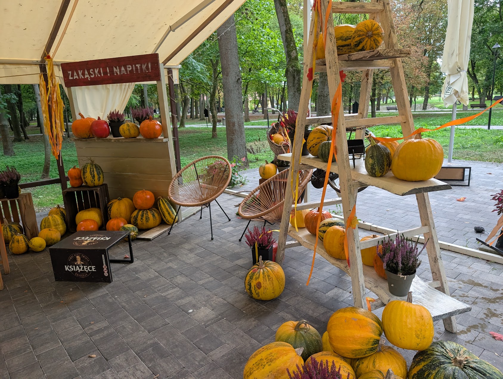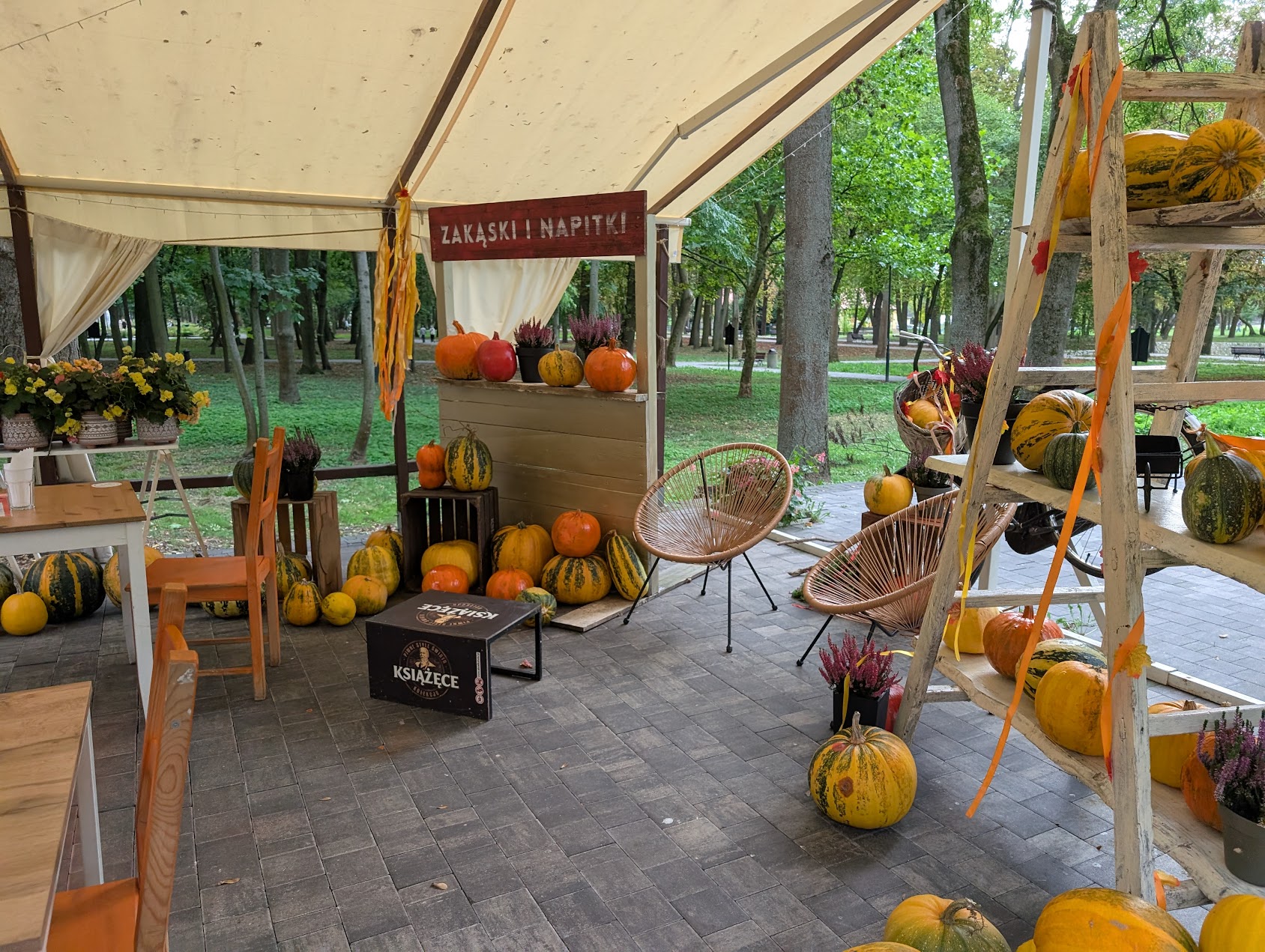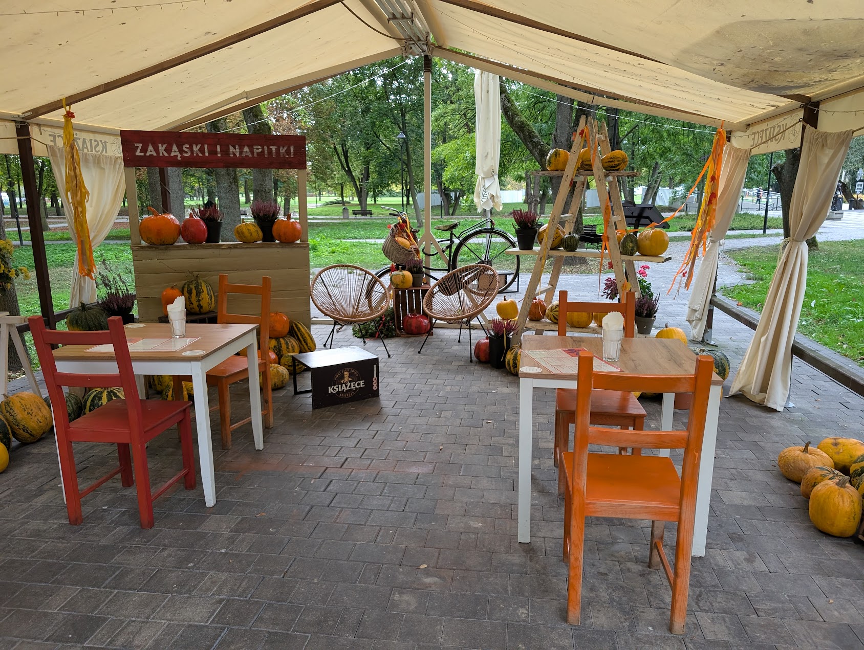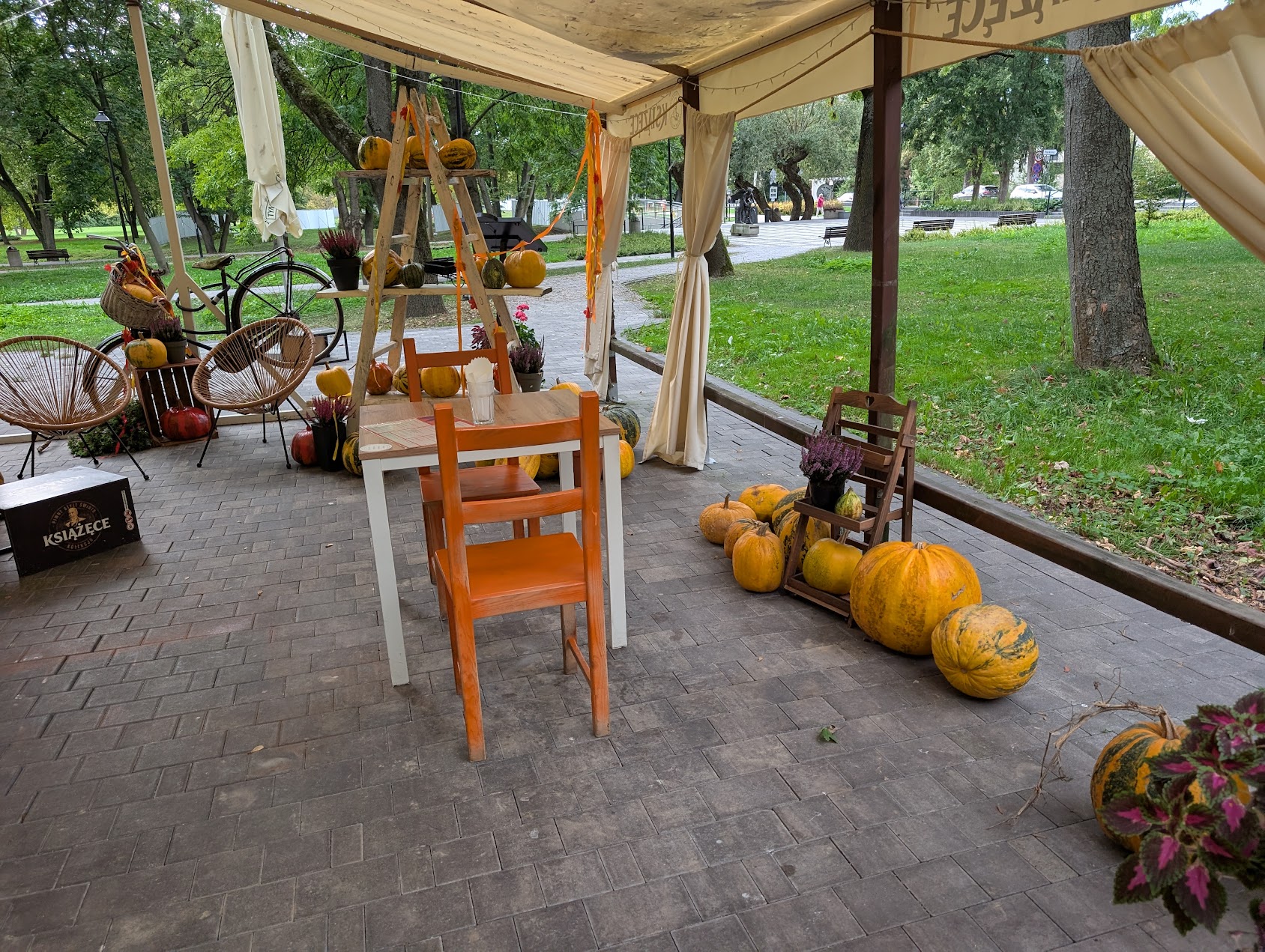 Podczas wycieczki  do Buska Zdroju wstąpiliśmy do klimatycznego lokalu gastronomicznego. Tuż przy „ogródku” kawiarnianym zobaczyliśmy klimatyczny namiot, udekorowany jesiennymi dyniami i wrzosami. Proste, drewniane stoły i krzesła w odcieniach pomarańczu oraz czerwieni tworzyły przytulną atmosferę, a w tle stoi rower i drabina ozdobiona dyniami – całość oddaje urok jesiennego spotkania przy napojach i przekąskach…