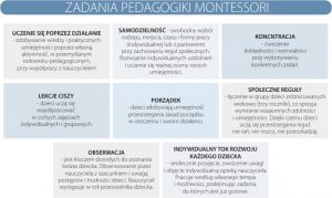 Proponujemy Wam zapoznanie się z ofertą interesującej edukacji dzieci, począwszy już od żłobka. Szkoła mieści się  na ulicy Wspólnej 2, ale są także placówki zlokalizowane w innych częściach miasta. Zabawa i nauka w takich placówkach opiera się na naukowej obserwacji dziecka, pamiętając że każde jest indywidualnością powinno podążać własną droga rozwoju. To wykorzystanie znanej od lat i ciągle aktualnej pedagogiki Montessori. To dziecko wybiera  sposób zdobywania doświadczeń stając sie odkrywcą, rozwijając swą samodzielność, cierpliwość i wszechstronność. Zasady  pedagogiki Montessori ilustruje tabela.