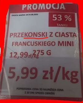 Przedstawiamy Wam handlowy plakat informujący o promocji. Oj, dzieje się na nim naprawdę wiele. To po prostu majstersztyk matematyki handlowej i językowej! Po pierwsze „przekonski” zamiast przekąski, czyli nowy gatunek kulinarny, może coś między koniem a rogalikiem? A dalej już tylko lepiej – 275 g za 5,99 zł/kg… czyli cud ekonomii, bo cena dotyczy nie produktu, tylko jakiegoś równoległego wszechświata promocji! Jest jeszcze informacja o „najniższej cenie z 30 dni”, tylko niestety, ta arytmetyka niewiele ma wspólnego z rzeczywistością. Oj widać tu jedynie obniżony poziom logiki, przypominamy więc, że w świecie promocji można wiele stracić… zwłaszcza zaufanie do ortografii i kalkulatora!