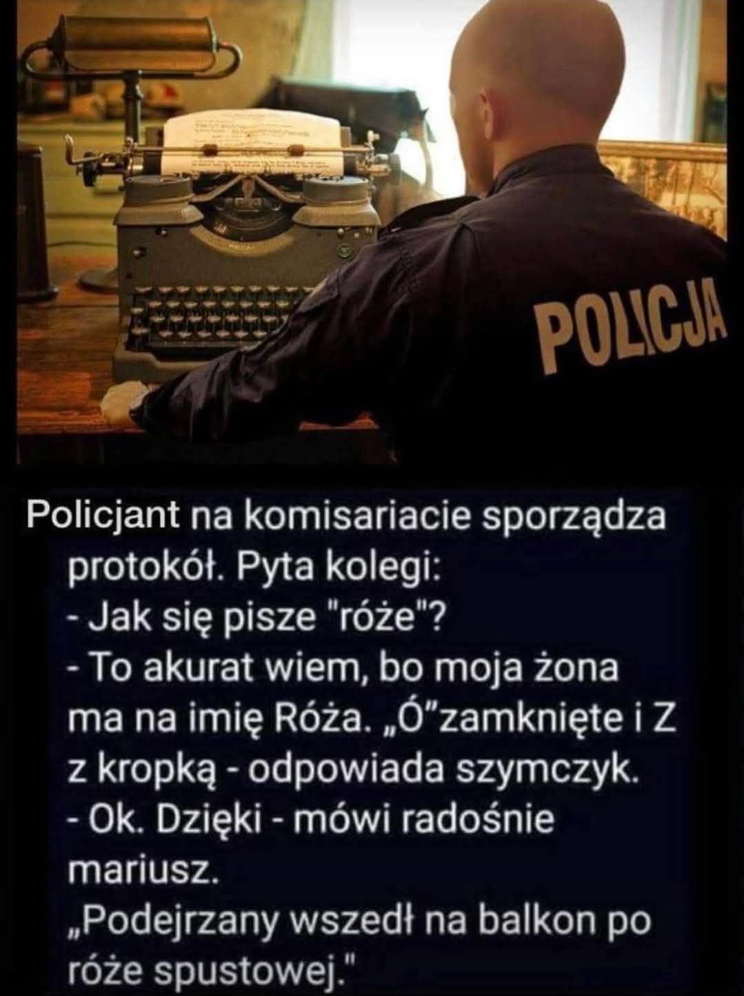 Uśmiechnijcie się, popatrzcie na starą maszynę do pisania i policjanta zapisującego coś na archaicznym sprzęcie. Sytuacja dotyczy notatki służbowej i troski o poprawność zapisu ortograficznego. Przez złą podpowiedź i skojarzenie rury z różą wyszedł absurdalny zapis. Jest to przykład humoru opartego na dosłownym myśleniu, braku świadomości językowej oraz śmiesznym skojarzeniu ortograficznym. Tak się zdarza, gdy ortografia spotyka protokół, powstają wówczas takie perełki: zamiast wejścia po rurze – wspinaczka po różach..