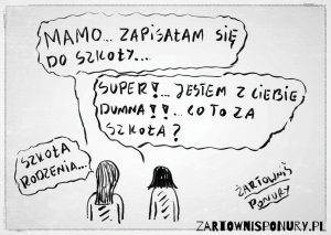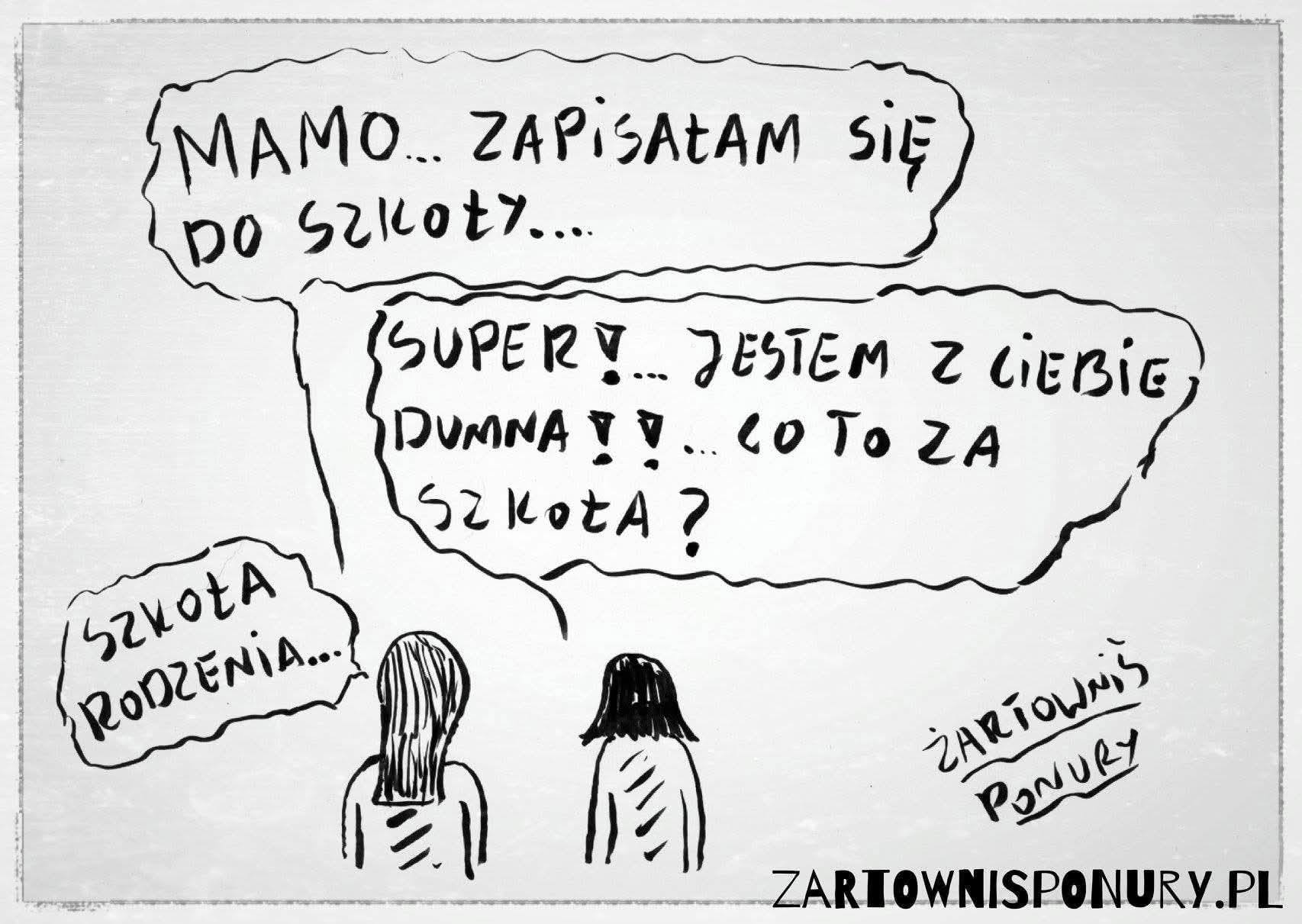 Na rysunku widzimy dwie postacie – córkę i mamę. Córka z dumą oznajmia, że „zapisała się do szkoły”. Mama reaguje entuzjastycznie, pełna dumy i zachwytu, dopóki nie pada doprecyzowanie: „szkoła rodzenia”. Cały żart polega na grze skojarzeń: mama myśli o „normalnej” szkole, córka – o miejscu, w którym uczy się czegoś zupełnie innego. Kontrast między oczekiwaniem a rzeczywistością tworzy zaskoczenie i lekki, sytuacyjny dowcip…
