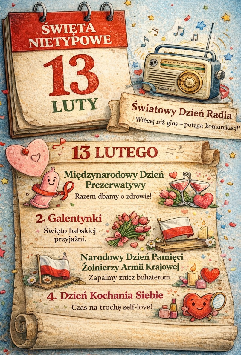 Nietypowe święta to dni dotyczące mniej znanym tematom, ideom lub zjawiskom, mają najczęściej charakter humorystyczny, edukacyjny albo promocyjny. Pojawiają się z inicjatywy organizacji międzynarodowych (np. kampanie zdrowotne), działań marketingowych firm i marek, określonych grup społecznych, które chcą zwrócić uwagę na ważne problemy społeczne, ludzi mających zamiar wprowadzić do kalendarza odrobinę humoru. Pamiętajmy więc , że kalendarz to nie tylko rocznice historyczne, ale też przestrzeń do budowania relacji, edukacji i dobrej zabawy. Dziś 13 lutego, no i mamy takie ciekawe święta…