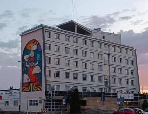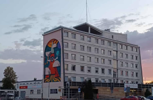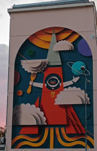 Na ścianie bocznej budynku Poczty Polskiej znalazł się niezwykły obraz przedstawiający kosmiczną epopeję kieleckich pierogów. W barwnych kształtach i geometrycznych liniach kryje się niezwykła historia – oto pierogi z Kielc poleciały w kosmos razem z polskim astronautą Sławoszem Uznańskim-Wiśniewskim. Artysta (Jakub Kamiński z Wrocławia) przedstawił je niczym bohaterów międzygwiezdnej wyprawy, otwierające się księgi symbolizują wiedzę i naukę, ale równie dobrze mogą przypominać… talerze, z których pierogi wystartowały. Promienie w górze to już nie słońce – to kosmiczny napęd, który wyniósł regionalny przysmak poza orbitę. Na konkurs wpłynęło ponad 120 prac, a najnowszy mural to kolejny akcent na mapie miasta, łączący lokalną tradycję z nowoczesną sztuką uliczną będący symbolem marzeń, ambicji i przekraczania granic. Stał się też wizytówką Kielc, które z humorem i dumą patrzą w przyszłość…