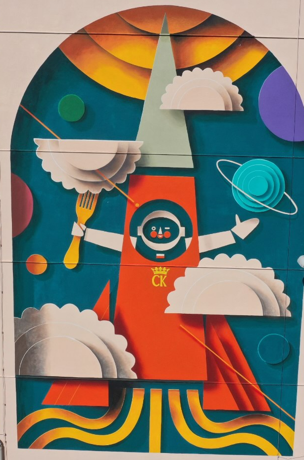 Na ścianie bocznej budynku Poczty Polskiej znalazł się niezwykły obraz przedstawiający kosmiczną epopeję kieleckich pierogów. W barwnych kształtach i geometrycznych liniach kryje się niezwykła historia – oto pierogi z Kielc poleciały w kosmos razem z polskim astronautą Sławoszem Uznańskim-Wiśniewskim. Artysta (Jakub Kamiński z Wrocławia) przedstawił je niczym bohaterów międzygwiezdnej wyprawy, otwierające się księgi symbolizują wiedzę i naukę, ale równie dobrze mogą przypominać… talerze, z których pierogi wystartowały. Promienie w górze to już nie słońce – to kosmiczny napęd, który wyniósł regionalny przysmak poza orbitę. Na konkurs wpłynęło ponad 120 prac, a najnowszy mural to kolejny akcent na mapie miasta, łączący lokalną tradycję z nowoczesną sztuką uliczną będący symbolem marzeń, ambicji i przekraczania granic. Stał się też wizytówką Kielc, które z humorem i dumą patrzą w przyszłość…