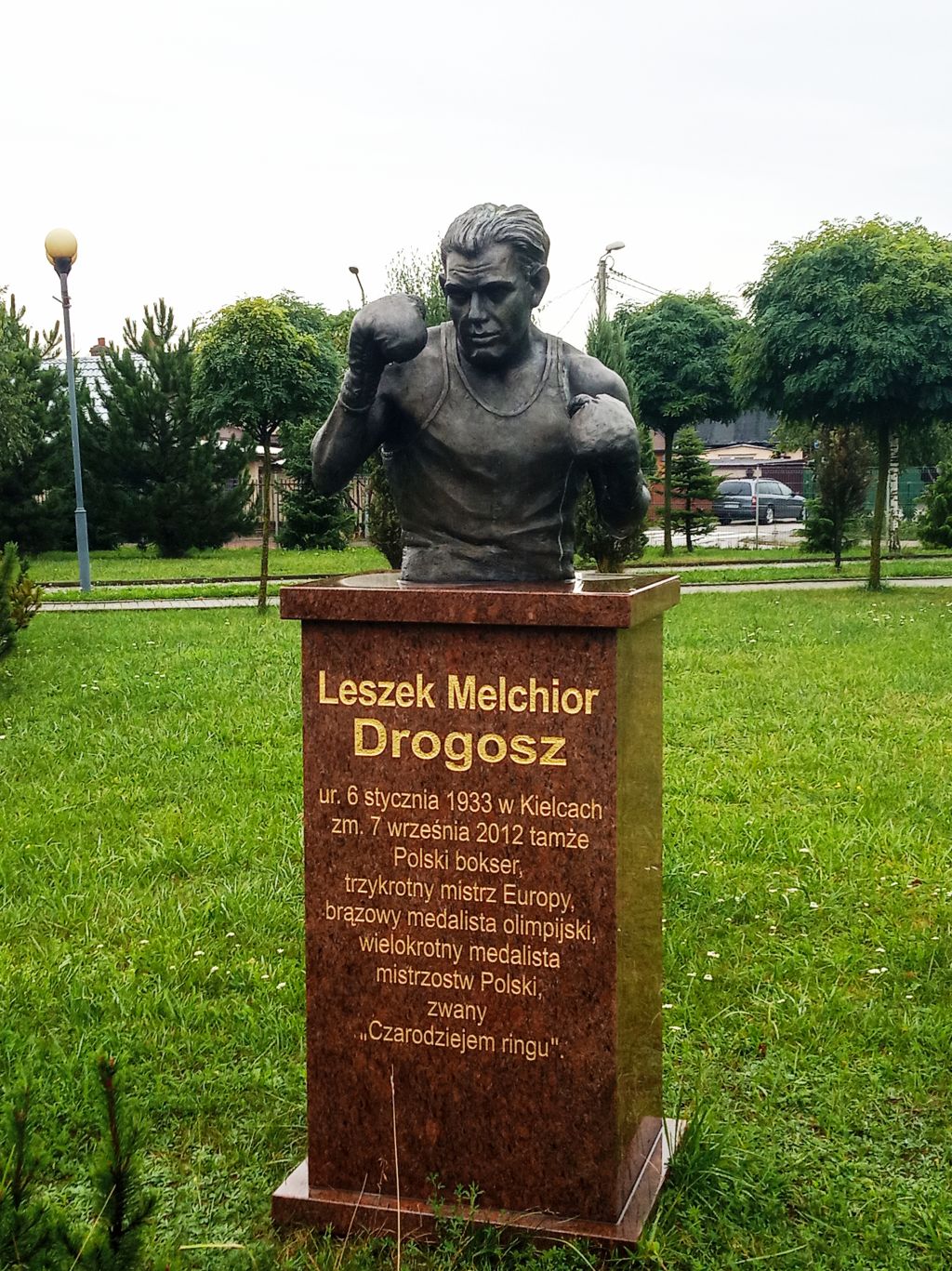 Leszek Drogosz to kolejna postać z katalogu wybitnych kielczan. To wspaniały sportowiec, bokser, istniejącego kiedyś w Kielcach Klubu „Błękitni”, olimpijczyk i kilkakrotny mistrz Europy. Postument stanął w pobliżu Hali Legionów w 2014 roku. Wcześniej rozważano umieszczenie popiersia w Alei Sław w parku nad Silnicą. Odsłonięcie pomnika wzbudziło kontrowersji ze względu na pozycję, jakiej został Leszek Drogosz przedstawiony (odwrotną od tej, w której walczył), wpisanie drugiego imienia (sportowiec podobno zupełnie go nie używał) oraz błędy w zapisie i jego podobieństwo do tekstu na witrynie internetowej. Dla wielu kielczan, a także rodziny najważniejszy jednak stał się sam fakt upamiętnienia boksera. Obok hali i pomnika jest także ulica Leszka Drogosza.