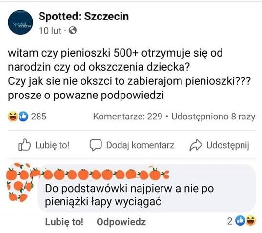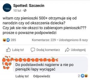 Zwalają z nóg niektóre wypowiedzi  w sieci.  Bez zbędnych komentarzy warto przytoczyć  pytanie pewnej pani (bez szacunku, więc  specjalnie małą literą), która ma dylemat finansowy. Jakże celna jest za to odpowiedź jednego z internautów (ogromne brawa się należą!).  Trudno niekiedy nie zgodzić się ze stanowiskiem, że świadczenia  otrzymują rodziny, gdzie nikt nie plami się legalną pracą, a bez pardonu wyciąga się ręce po różnego typu zasiłki  i dodatki (np. dodatek z tytułu urodzenia dziecka, opieki nad dzieckiem w okresie korzystania z urlopu wychowawczego, wychowywania dziecka w rodzinie wielodzietnej, rozpoczęcia roku szkolnego, świadczenie „Za życiem”, mieszkanie komunalne, dodatek mieszkaniowy,  dopłaty do obiadów (nie tylko dzieci), zapomogi itd.). Serce boli…