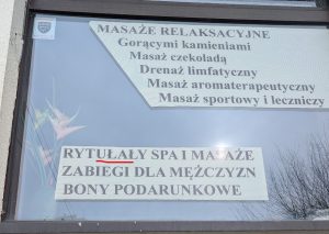 Spacer po mieście pozwala znaleźć niezwykle „perełki” do naszej kolekcji językowych ciekawostek. Na jednej z kieleckich ulic zauważyliśmy dużą witrynę okienną z reklamą usług wykonywanych przez salon masażu i SPA. Ma ona charakter informacyjny, ale w centralnym jej miejscu rzuca się w oczy rażący błąd ortograficzny w słowie rytuały. Takie potknięcie językowe podważa profesjonalizm miejsca, a przekaz traci na wiarygodności, choć można było tę nieprawidłowość łatwo wyeliminować posiłkując się słownikiem ortograficznym. Ponadto razi brak znaków interpunkcyjnych czy ciekawych grafik, dlatego komunikat nie jest przejrzysty. Wyliczanka daje wrażenie chaosu i zmniejsza estetykę przekazu. Przypominamy, że w branży spa i wellness, gdzie liczy się harmonia, spokój i dbałość o detale, taka forma ogłoszenia znacząco osłabia wizerunek miejsca. Trudno w tej sytuacji nie wystawić oceny niedostatecznej zarówno wykonawcy reklamy, jak i właścicielom lokalu. Pamiętajcie: w przestrzeni publicznej każdy komunikat jest wizytówką firmy, jeśli zawodzi staranność językowa i estetyczna, trudno oczekiwać, by odbiorca bez wahania zaufał jakości oferowanych usług…