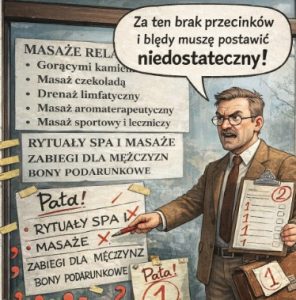 Spacer po mieście pozwala znaleźć niezwykle „perełki” do naszej kolekcji językowych ciekawostek. Na jednej z kieleckich ulic zauważyliśmy dużą witrynę okienną z reklamą usług wykonywanych przez salon masażu i SPA. Ma ona charakter informacyjny, ale w centralnym jej miejscu rzuca się w oczy rażący błąd ortograficzny w słowie rytuały. Takie potknięcie językowe podważa profesjonalizm miejsca, a przekaz traci na wiarygodności, choć można było tę nieprawidłowość łatwo wyeliminować posiłkując się słownikiem ortograficznym. Ponadto razi brak znaków interpunkcyjnych czy ciekawych grafik, dlatego komunikat nie jest przejrzysty. Wyliczanka daje wrażenie chaosu i zmniejsza estetykę przekazu. Przypominamy, że w branży spa i wellness, gdzie liczy się harmonia, spokój i dbałość o detale, taka forma ogłoszenia znacząco osłabia wizerunek miejsca. Trudno w tej sytuacji nie wystawić oceny niedostatecznej zarówno wykonawcy reklamy, jak i właścicielom lokalu. Pamiętajcie: w przestrzeni publicznej każdy komunikat jest wizytówką firmy, jeśli zawodzi staranność językowa i estetyczna, trudno oczekiwać, by odbiorca bez wahania zaufał jakości oferowanych usług…
