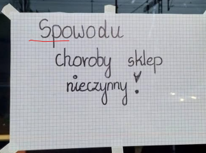 Znaleźliśmy w sieci „ciekawe” zdjęcie. Mamy tu przykład rażącego błędu, który może być też przykładem humoru językowego. Okazuje się bowiem, że nawet sklepy czasem muszą odpocząć. Ten najwyraźniej złapał wirusa razem z właścicielem! Z powodu ortografii – zalecamy właścicielowi sklepu trochę nauki. Skoro sklep nieczynny, to niech słownik będzie otwarty. Życzymy szybkiego powrotu do zdrowia – i do handlu. Przypominamy: choroba minie, ale błędy językowe – tylko po korekcie!