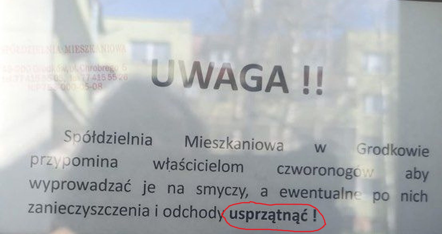 Troska gospodarzy terenu o jego czystość jest uzasadniona. Nie wszyscy bowiem pamiętają, że posiadanie  zwierzęcego przyjaciela, zobowiązuje. W Grodkowie, w województwie opolskim – władze spółdzielni przypominają o sprzątaniu odchodów po swoich pupilach, niestety  – istotny w tej informacji wyraz napisano z błędem. My upraszczamy tę prośbę przypominając właścicielom czworonogów: Twój pies (kot), Twoje gówno! Mamy jeszcze taki wniosek, dbajmy o poprawną pisownię.