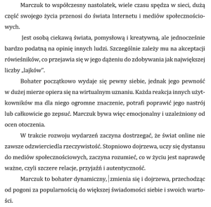 - Po pewnym czasie odkrywa, że wirtualne uznanie nie zawsze przekłada się na prawdziwe relacje i poczucie własnej wartości.