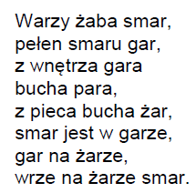 - powtarzalność elementów, smar”, „gar”, „żar” tworzą łańcuch skojarzeń oraz zabawny efekt fonetyczny.