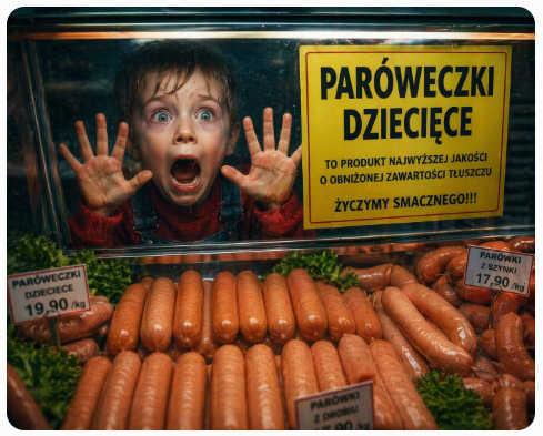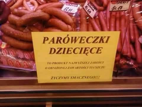 Pokazujemy Wam zdjęcie wędliny z napisem „Paróweczki dziecięce”, który może wywołać niezamierzony efekt – zamiast „dla dzieci”, brzmi jakby były… z dzieci. U klientów etykieta wywołuje lekkie zdziwienie, choć być może jest to przede wszystkim chwyt marketingowy. Taki komunikat pokazuje znaczenie języka w reklamie, jedno nieprecyzyjne sformułowanie potrafi całkowicie zmienić sens komunikatu i wywołać absurdalne skojarzenia, przekaz zamiast działać, zaczyna bawić…